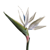 Sculpture reimagined in cool and warm tones combination. This artificial Bird of Paradise opens in porcelain blades with light warming tone tipped with cobalt and electric blue, rising from a lime-to-olive spathe with a soft rose flush at the base. The segmented, wired stem allows a disciplined arc for poised placement—graphic on its own, dramatic when grouped. Stand a single piece in a tall cylinder for gallery calm; pair two for entry symmetry; cluster three to crown a floor composition. It sharpens neutrals, cuts clean through lush greens, and can photograph with crystalline clarity.