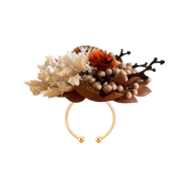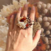 From above, the ring reads as a rounded, slightly offset cluster, anchored by a central disc that catches the eye. Soft clusters of cream and white create a pale halo, while deeper notes of rust, caramel and warm brown sit closer to the base, so the palette feels like oat and ember rather than bright colour. Small spheres and fine spikes break up the surface, giving depth and rhythm without clutter. From the side, the bloom rises in a gentle dome, low enough for ease of wear, resting on a slim open band with two polished spheres that keep the weight balanced and the profile calm against the hand.