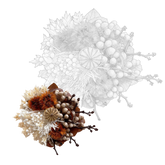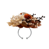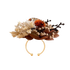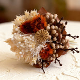 This Summer Christmas ring gathers a small field of dried botanicals into one compact bloom. Brown red hydrangea bracts cradle tufts of white and warm beige rice flower, both soft and berry like. Deep orange Stirlingia heads sit among white Ming fern, mini natural poppy pods and sprays of feather reed grass, all resting on a collar of warm brown foliage. Together they feel like a handful of harvest light, refined and held in place above a clean silver tone open band.