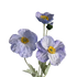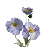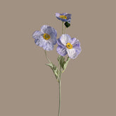 Crisp and quietly joyful. Three artificial soft lilac poppies rise at staggered heights along a botanical stem, the line lifting in a gentle arc from base to tip. One bloom reads the fullest, while two graduated blooms set a calm rhythm, with a single bud completing the story from promise to open. Petals are fine and lightly crinkled with softly rolled edges; a mist green disc sits at each heart, ringed with lemon filaments that catch the light. Leaves gather low on the stem, arranged in tidy pairs or small clusters so the outline stays clean and the round faces feel lighter and more buoyant. The mood is soft and serene, like dawn light washed in lilac, calm and quietly uplifting.