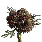 This premium artificial set includes three stems built around Skimmia bud spheres, and it speaks in rich earth tones: hundreds of tiny, trumpet tipped buds radiate from each core in an ombré that moves from olive green to russet brown with soft red casts, their seed pearl texture reading crisp and matte. We’ve replaced the usual glossy lanceolate foliage with deep green, fern-like leaves that lift the rounded clusters into a taller, more tailored silhouette while framing a warm nucleus for heightened contrast; the fronds open like a fine cape, turning points into planes so the whole reads modern, disciplined and full of cadence. Styled together the three stems feel gallery clean yet inviting, equally at home in festive Christmas tablescapes and in industrial or serene minimalist interiors, where their measured geometry adds calm without noise.
