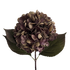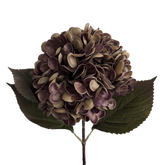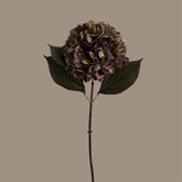 This artificial hydrangea presents a full sphere built from hundreds of four petal florets, tightly stacked so the surface reads as fine, even undulation. Many flowers sit half hidden within the layers while a few at the rim lift and tip forward, creating a gentle bead like rhythm. Fallen Leaf color blends olive green, tobacco brown and dusky color. Petal faces move from smoky olive to muted tones toward the throat, with the reverse catching wheat and tea notes so the head feels patinated, like autumn foliage after sun. A straight botanical stem with clear nodes carries the round mass. Broad ovate leaves, neatly serrated, gather beneath the cluster to form a steadying collar that keeps the silhouette composed. The mood is full yet restrained, clean in outline and strong in structure, ideal as a round focal in arrangements or a single stem statement that brings order and quiet weight to a space.