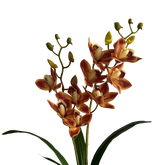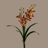 A calm statement for rooms that prefer order over noise. This lifelike artificial cymbidium sends each spike from the base in an easy arc, blooms set along the stem with even rhythm. Outer buds hold tight, inner cups open gently, so the eye reads a measured shift from points to planes, full yet never crowded. Petals carry burnished persimmon with creamy throats and a hint of clove red at the lip; the colour reads warm and grounded, elegant rather than loud. Strap leaves rise in layered fans, edges clean and veins fine, the interplay of deep green and soft green giving the silhouette depth. At the base, flexible aerial root detail traces the rim of a planter with a natural curl, completing the plant from root to flower. One pot centres an entry or sideboard, set on the floor it stands tall and composed, grouped on shelves it reads tidy and fresh. It fits many common indoor planters, lets you change vessels by season, needs no watering or trimming, no pollen, only the occasional dusting.