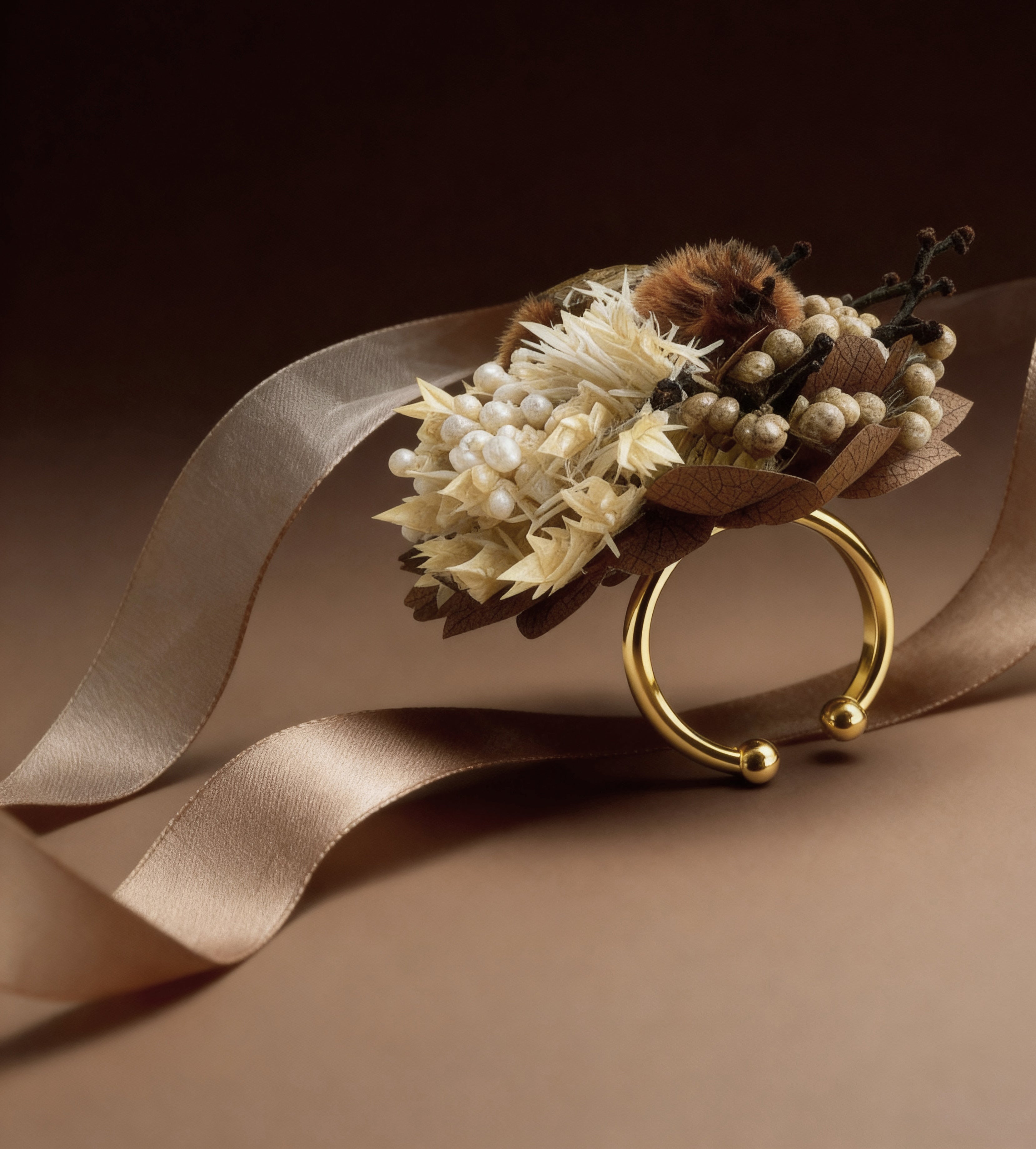 Each piece gathers preserved petals, seed forms and harvest inspired details into a refined structure that sits close to the skin. Soft gold and mellow caramel recall sunlit fields and stand for the year’s honest work, at home and at work. Natural textures remain visible with a unique sense of life. From slender rings to delicate earrings, the silhouettes are airy and composed, easy with linen, silk and simple cotton dresses.