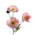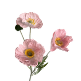 Crisp and quietly joyful. Three artificial poppies in Nymph Pink rise at staggered heights along a botanical stem, the line lifting in a gentle arc from base to tip. One bloom reads the fullest, while two graduated blooms set a calm rhythm, with a single bud completing the story from promise to open. Petals are fine and lightly crinkled with softly rolled edges; a mist green disc sits at each heart, ringed with lemon filaments that catch the light. Leaves gather low on the stem, arranged in tidy pairs or small clusters so the outline stays clean and the round faces feel lighter and more buoyant. The mood is tender and luminous, like first light on blush silk, soft yet confident.