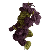 Garden crispness with a moody edge. This premium artificial foliage spray carries textured, crinkled leaves in a plum-and-olive bicolour, upper surfaces read deep plum with inky marbling, while undersides lift to olive with chartreuse highlights. The layered rosettes step along a slender botanical stem, adding freshness, depth and fine grained detail. Solo in a petite vessel it feels contemporary and intentional; grouped, it builds a brisk, kitchen-garden accent that wakes the palette without overpowering blooms.