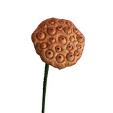 Sculptural and quietly striking. The head forms a rounded dome with a gentle crown, the surface patterned by ordered dimples, each centred by a fine dark dot like neat seed chambers. The spacing feels balanced, so the look is full yet rhythmic. The rim draws in smoothly with no sharp corners, keeping the silhouette clean. A subtle granular finish runs along the botanical stem for natural realism. The colour reads bronze red, warm terracotta pooling across the planes. In the recesses the form reads deeper, with fine dark dots suggesting the pores for calm depth.