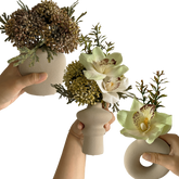 Three pieces, one story. Stone Garden is a set of three small arrangements designed to work as a trio, each with its own shape, but all tied together by the same clean, grounded palette. Cymbidium orchids bring that sculptural, refined lift, while skimmia bud balls add a gathered, harvest like texture that feels fresh and considered, not busy.