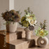 • Presentation: Anchored in a set of three stone coloured vases, approximately 10 cm in height. Each vase measures around 8–10 cm in width.