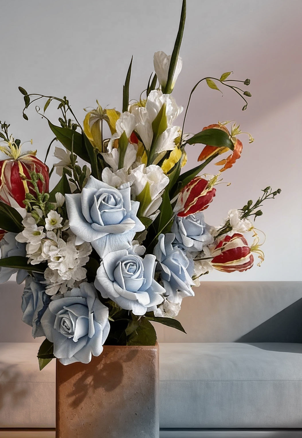 Built from the feeling of New Year’s fireworks, that suspended second when white smoke lingers and red and blue keep moving through it. Cool blue roses hold the centre, red flares cut in like a clean spark, and warm notes glow at the edges, like golden bursts catching the night.
