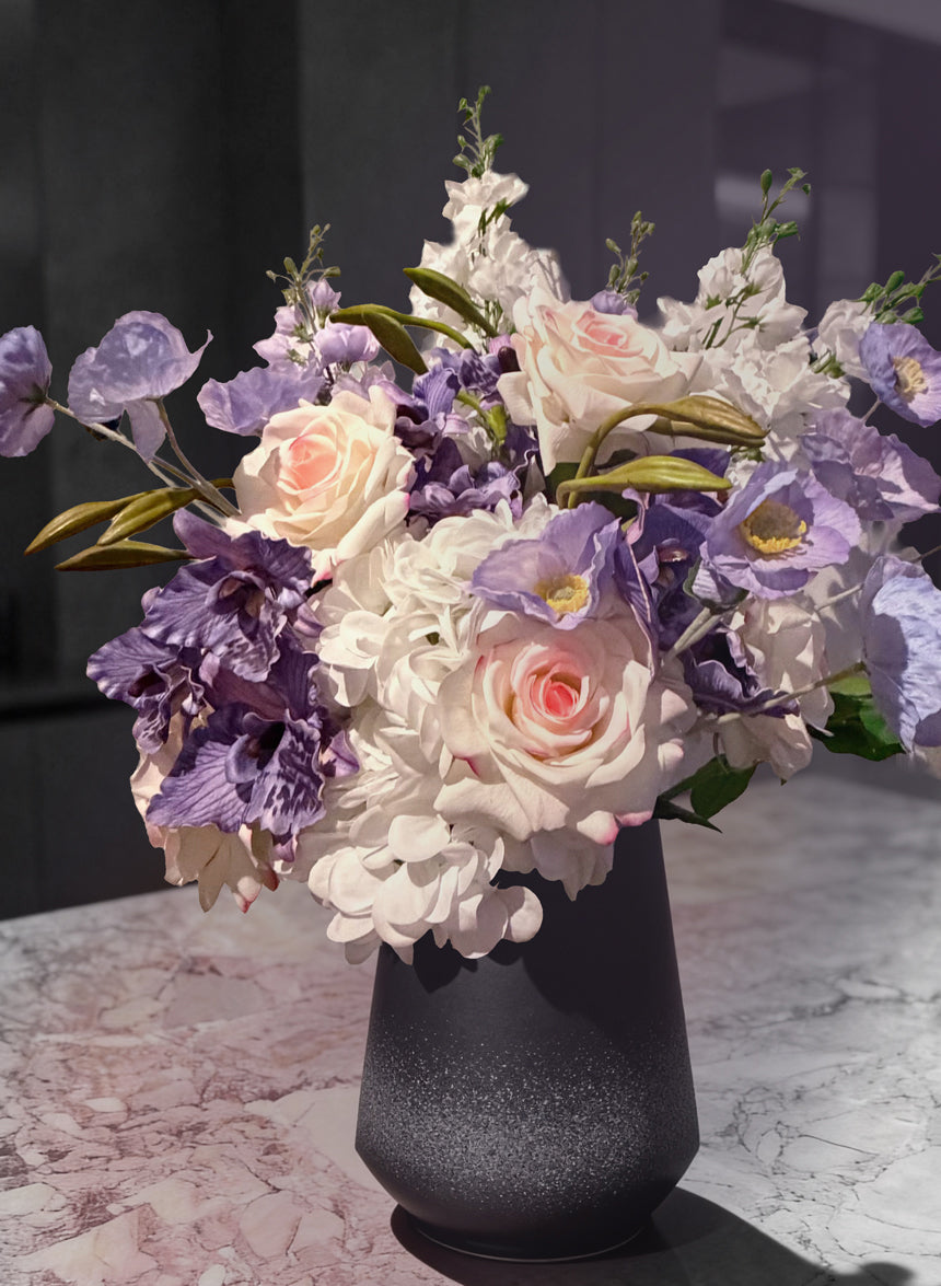 White and violet weave through each other like a soft breeze moving through the house, light, clean, elegant. Blush white roses hold the centre as a calm anchor, while lilac poppy faces spark through the cluster, playful, bright, impossible to ignore. Hydrangea builds a cloud like base, and deeper violet orchid notes add depth so the whole piece feels layered and dimensional, never overly sweet.