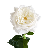 A poised study in rosette romance. One artificial stem carries a full, layered English style bloom in Serene White with a mellow cream heart, accompanied by a neat bud that adds freshness and narrative. Petals are closely set and gently cupped, the outer whorl calm and ivory toned, the centre finely ruffled with a soft candlelit glow. Subtle veining and a natural curl give dimension from every angle. Set on a slender botanical stem, it places cleanly in slim vessels, glows in pairs and feels quietly sumptuous when threaded through larger arrangements.