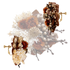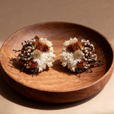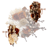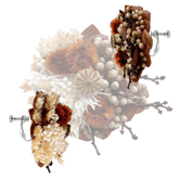 From the front, each earring reads as a rounded, slightly offset cluster, anchored by a central disc that draws the eye. Soft clusters of cream and white create a pale halo, while deeper notes of rust, caramel and warm brown sit closer to the base, so the palette feels like oat and ember rather than bright colour. Small spheres and fine spikes break up the surface, giving depth and rhythm without clutter. From the side, the blooms rise in gentle domes that sit close to the jawline, suspended from slim fittings that keep the weight balanced and the profile calm as you move. The domes sit low and composed, earring clips designed to feel present in photographs and gatherings yet intended for extended wear with suitable care, from daytime events through to evening.