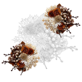 This Summer Christmas pair gathers a small field of dried botanicals into two compact blooms. Brown red hydrangea bracts cradle tufts of white and warm beige rice flower, both soft and berry like. Deep orange Stirlingia heads sit among white Ming fern, mini natural poppy pods and sprays of feather reed grass, all resting on a collar of warm brown foliage. Together they feel like two small handfuls of harvest light, refined and held in place beneath discreet metal fittings that let the flowers take the focus.