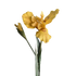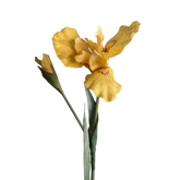 Vibrant, poised and bright. This artificial iris stands on a straight botanical stem with a single open flower at the tip. Three outer segments spread to a deep warm yellow with butter yellow falls softly shaded in amber and faint russet feathering at the throat. The inner segments stand upright in a clear warm yellow, adding height and a calm vertical. A side branch carries one half-closed bud so the line reads from promise to bloom with measured rhythm. Paired sheath bracts wrap the junction at the head for a neat transition. Long, sword-shaped leaves hold close to the stem and lift the profile so the silhouette stays tall and assured.