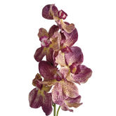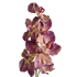 Sculptural and assured. A straight botanical stem lifts a run of blooms set in gentle offsets, opening from tip to base with a clear sense of progression. Each flower shows broad petals and sepals with soft undulation at the rim, the lip lifted forward for depth, so the face reads like a rippled wing. The colour moves through purple amber, a warm amber yellow ground veiled with purple speckling; the lip holds a mulberry glow that gives depth and drama. Smaller blooms settle near the tip for a measured pause in the composition. The stem is presented without foliage, keeping the line clean for modern display. Beautiful solo in a narrow vessel, or as a main flower that gives structure and presence inside arrangements.